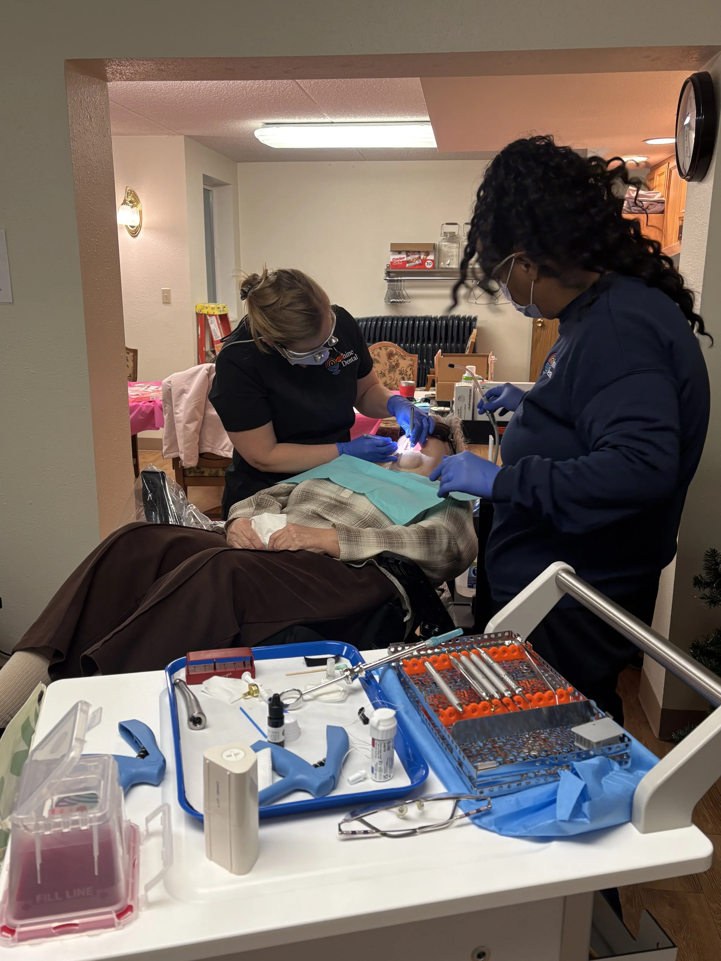 • On-site dental services using portable equipment and a mobile dental chair, allowing us to deliver high-quality care directly to patients in their communities